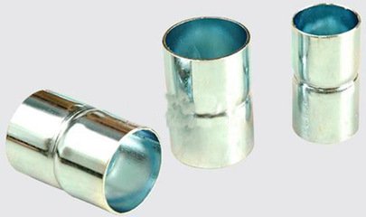 采用优质管材加工而成,双面镀锌保护,供管与管连接用。管接头中间有一道用滚压工艺压出的凹槽,所形成的锥度,可使导管插入紧定位,密封性好,暗敷时砂浆甚至水泥不易进入导管内;而凹槽深度与导管壁厚一致,导管插入后内壁平整光滑,不影响穿线。靠近管接头两端各有一个(ø32以上两个)带紧定螺钉的螺纹孔,该螺纹孔的长度大于管接头壁厚,是用冲压工艺由管内壁向管外壁冲压形成凸起后再攻丝开成,螺纹圈数增多使紧定连接更牢靠。紧定螺钉为特制,紧拧端呈六角形并有“+”字槽,另一端呈窝状;靠近续拧紧紧定螺钉,直至拧断“脖颈”使导管与接头成为一体,无需再做接地跨接线。规格有五种,与相应的导管配套使用。